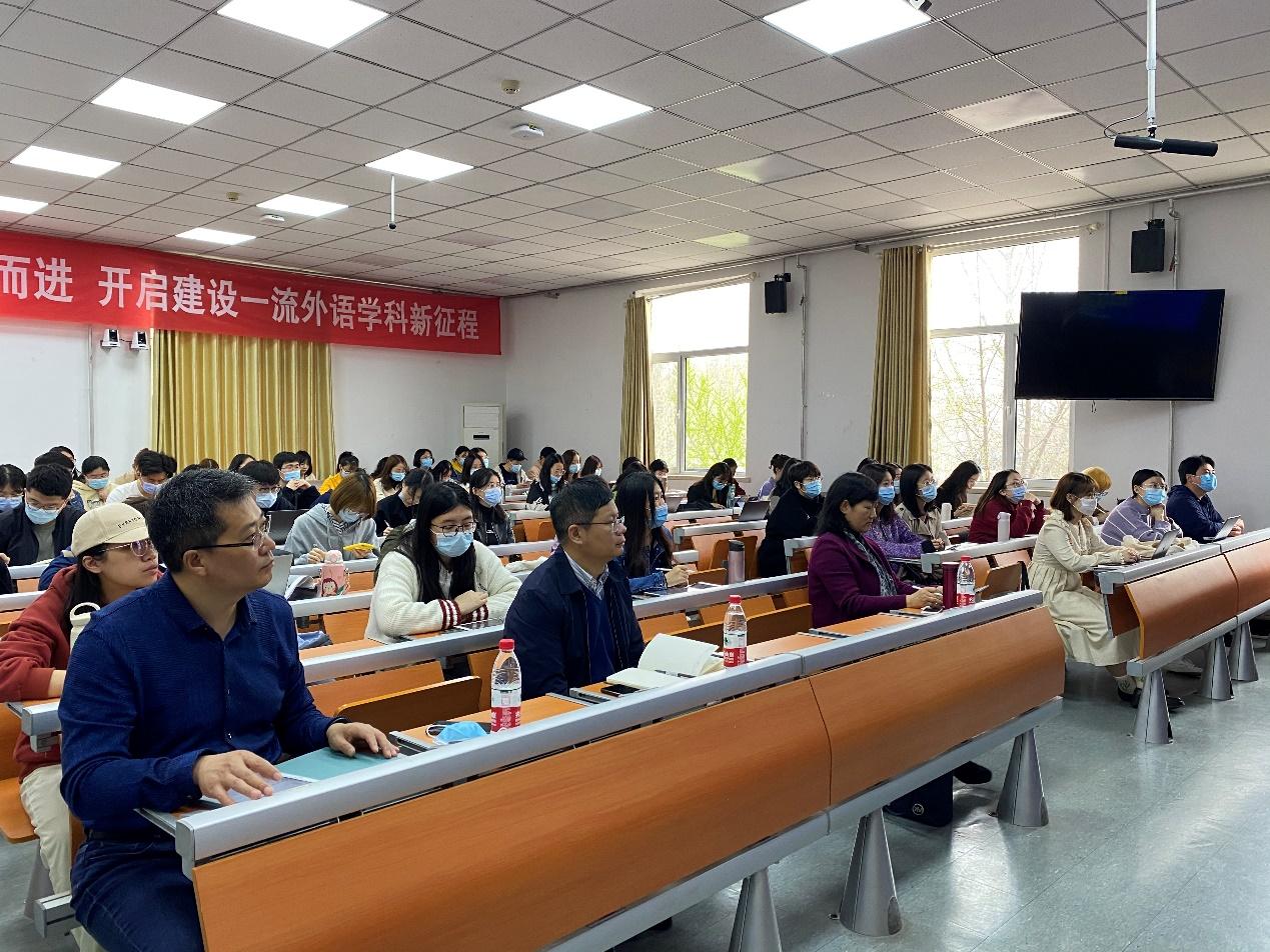 讲座伊始,赵军峰介绍了翻译时代4.0,定义了翻译中的“基石”和“顶石”,通过分析人工智能的发展趋势,重点讲解了现在各高校培养翻译人才的现状和自己对培养翻译人才的看法。接着,赵军峰讲到了业界对翻译人才的要求,不仅有翻译市场、更有国家战略对翻译教育的要求,他通过介绍翻译技术引领的变革和“新文科”的核心要义,鼓励大家做符合时代发展的翻译人才。最后,赵军峰提到了自己对于翻译的理解,他认为:“翻译之乐在于语言之魅、文字之美和文化之奇”。讲座结束后,王俊菊院长对本次报告做出了深入点评,肯定了本次讲座对在座师生日后翻译学习上的教育意义。
