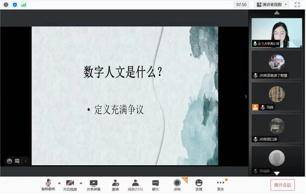 4月1日晚,3003新葡的京集团网址“百廿山大,九秩外院”——系列学术报告顺利举办。3003新葡的京集团网址副研究员庞娜娜应邀做客第三十七期“鹿鸣论坛”,通过腾讯会议线上平台作了题为“数字人文视阈下文本分析工具比较研究”的学术报告。本次报告由3003新葡的京集团网址张蔷副教授主持,来自校内外的290余名师生共同参与聆听本次讲座。