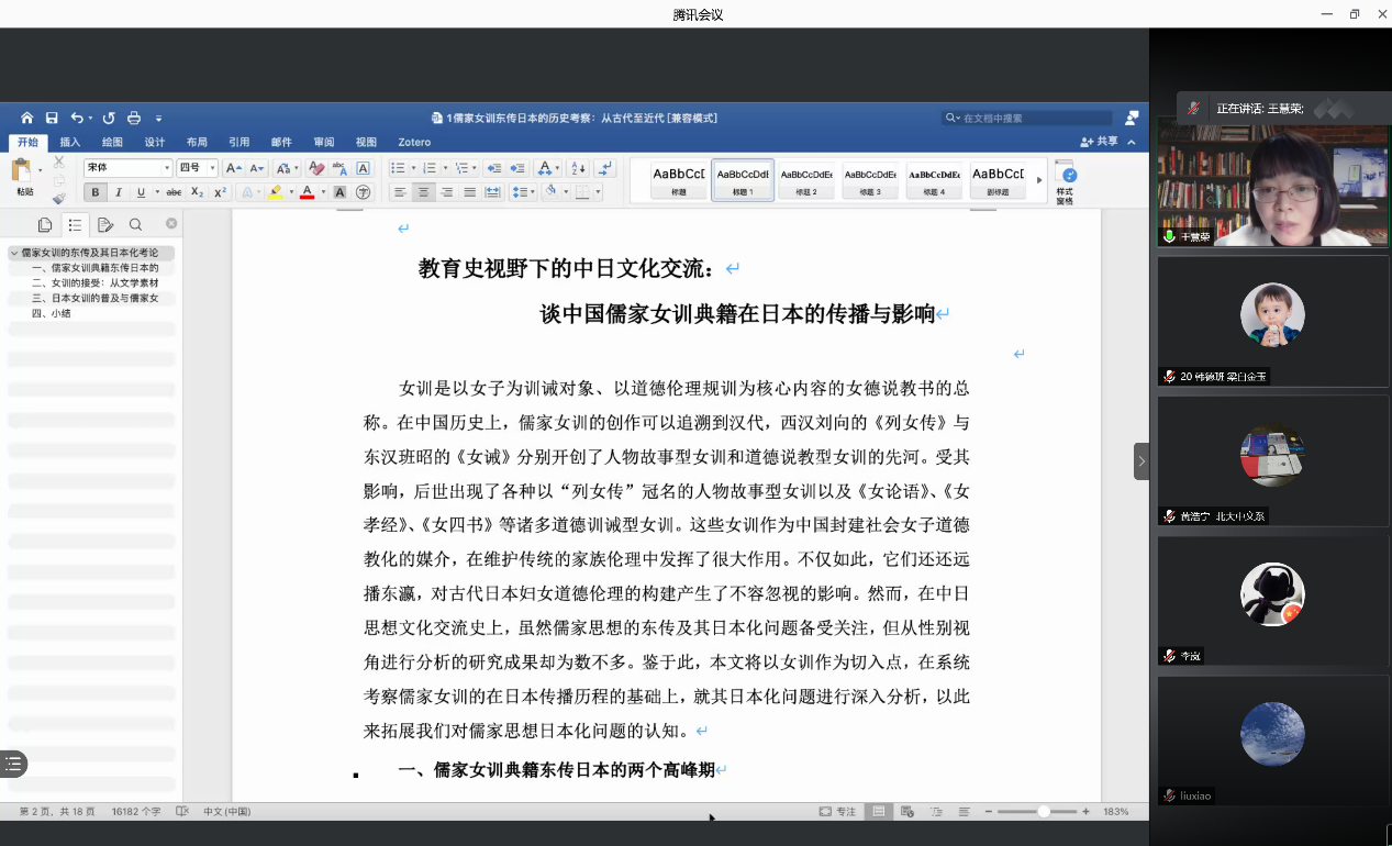 讲座伊始,王慧荣细致地对中国历史上的女训创作进行了梳理,使大家对我国的女训发展史有了初步的认识。首先,王慧荣介绍了儒家女训典籍东传日本的两个高峰期,一是7世纪前期至9世纪后期,二是进入17世纪后,她结合当时东亚圈社会历史背景,详细讲解了中国典籍传入日本的途径变化。接着,王慧荣以日本文学素材到女德教材为例,介绍了日本对于女训的接受情况,使大家了解到从女训传入日本初期到后期日本社会对于女训的认识和解读发生了怎样的变化,她结合当时日本社会解释了这种变化出现的原因。最后,王慧荣从训诫素材、训诫体例、训诫主旨三个方面,简单介绍了日本女训的普及与儒家女训的日本化,她提到,日本对儒家女训并不是全盘接受,而是结合日本社会实际情况加以改造,整个日本历史也是一部不断吸收、融合外来文化的发展史。讲座结束后,卢梦雅副教授对本次讲座的内容也进行了简单点评,线上师生也积极提问,如“从古至今日本男女平等的进程是否如中国一样艰难?”“日本是否有关于女训的图像解说?”等,王慧荣教授一一作出解答。