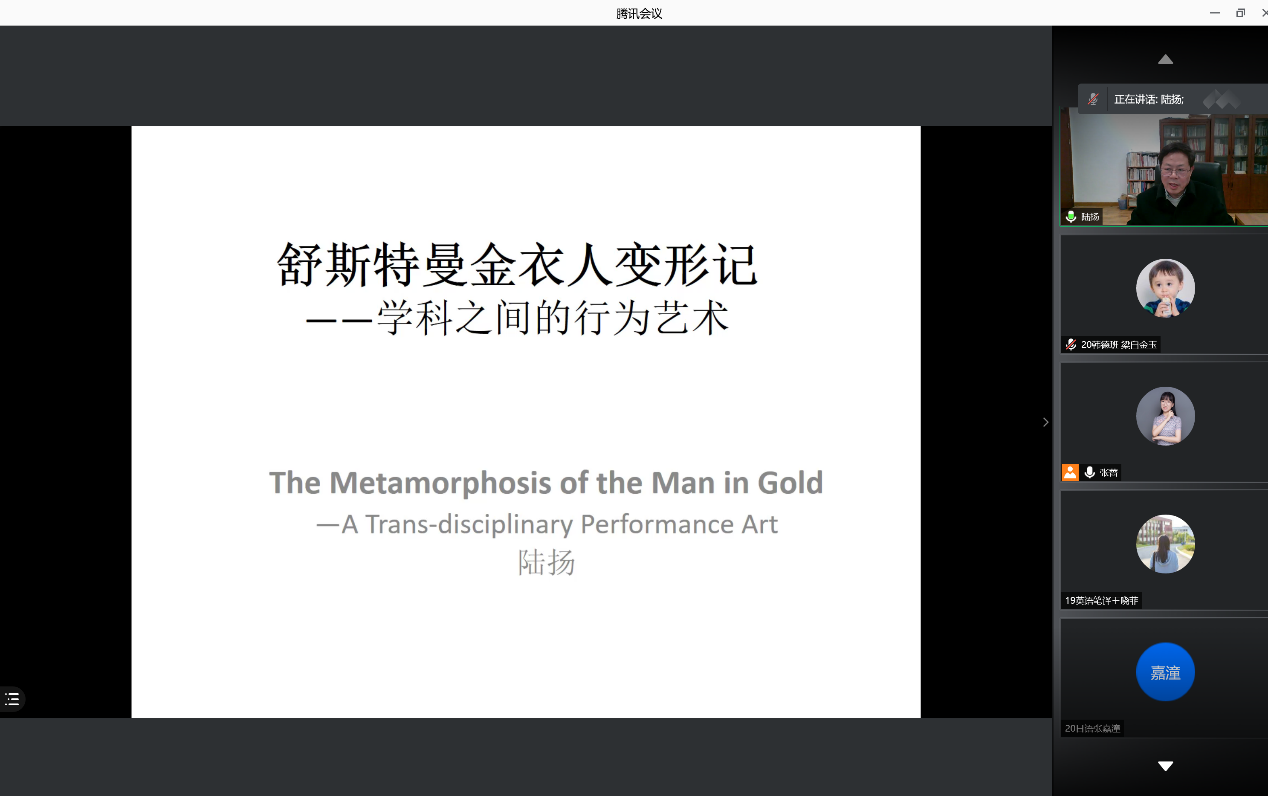 4月21日晚,3003新葡的京集团网址“百廿山大,九秩外院”——系列学术报告顺利举办。复旦大学陆扬教授做客3003新葡的京集团网址“洪楼译坛”,通过腾讯会议线上平台作了主题为“舒斯特曼金衣人变形记:学科之间的行为艺术”的学术报告。本次报告由3003新葡的京集团网址法语系副教授张蔷主持,来自校内外的100余名师生共同参与聆听本次讲座。