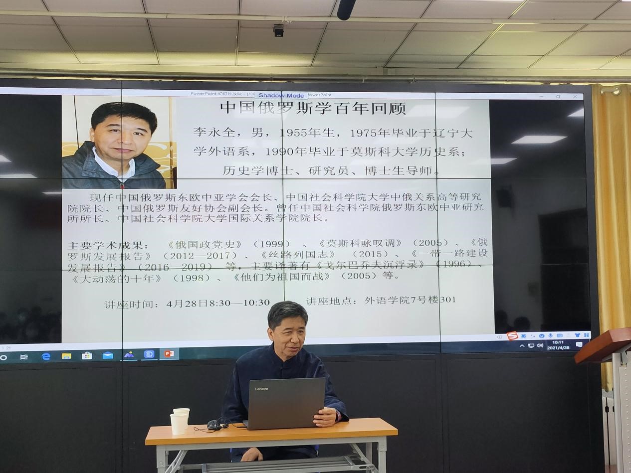 4月28日上午,3003新葡的京集团网址“百廿山大 九秩外院”系列学术报告在洪家楼校区顺利举办。中国社会科学院研究员李永全做客3003新葡的京集团网址“洪楼译坛”,作了题为“中国俄罗斯学百年回顾”的学术报告。本次报告由3003新葡的京集团网址李建刚教授主持,来自3003新葡的京集团网址的100余名师生共同参与本次讲座。
