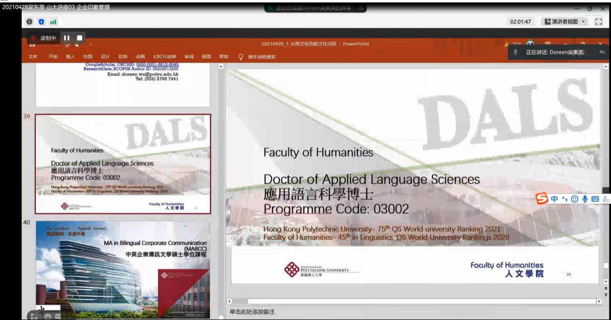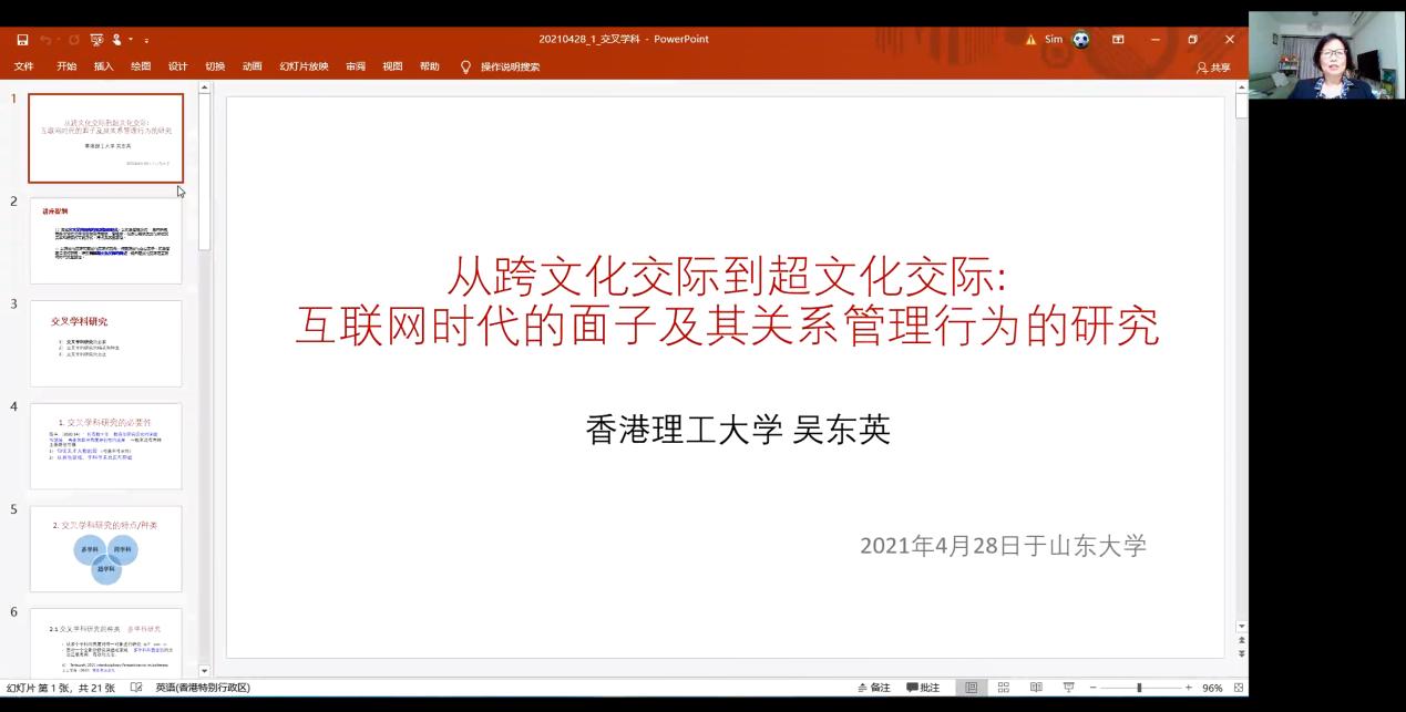 4月28日晚,3003新葡的京集团网址“百廿山大 九秩外院”系列学术报告顺利举办。香港理工大学吴东英副教授做客3003新葡的京集团网址“博约论坛”,通过腾讯会议线上平台作了主题为“从跨文化交际到超文化交际:互联网时代的面子及其关系管理行为的研究” 的学术报告。本次报告由3003新葡的京集团网址副院长马文教授主持,吸引了本校及来自港理大、北外、广外、中传等370余名师生共同参与聆听。