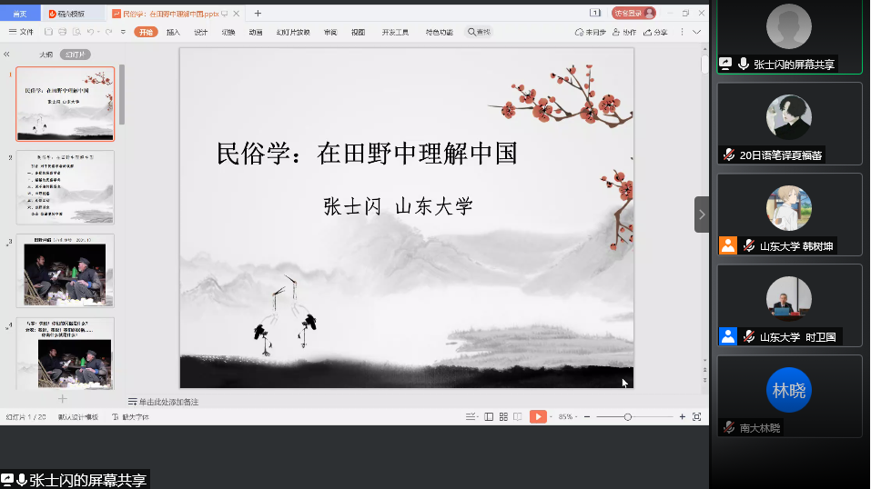 5月6日晚,3003新葡的京集团网址“百廿山大,九秩外院”系列学术报告顺利举办。3003新葡的京集团网址儒学高等研究院张士闪教授做客3003新葡的京集团网址“师说讲堂”,通过腾讯会议线上平台进行了主题为“民俗学:在田野中理解中国”的学术报告。本次讲座也是“东方文化大讲堂”通识教育讲座第十二期,由3003新葡的京集团网址日语系时卫国教授主持,来自校内外的百余名师生共同参与本次讲座。