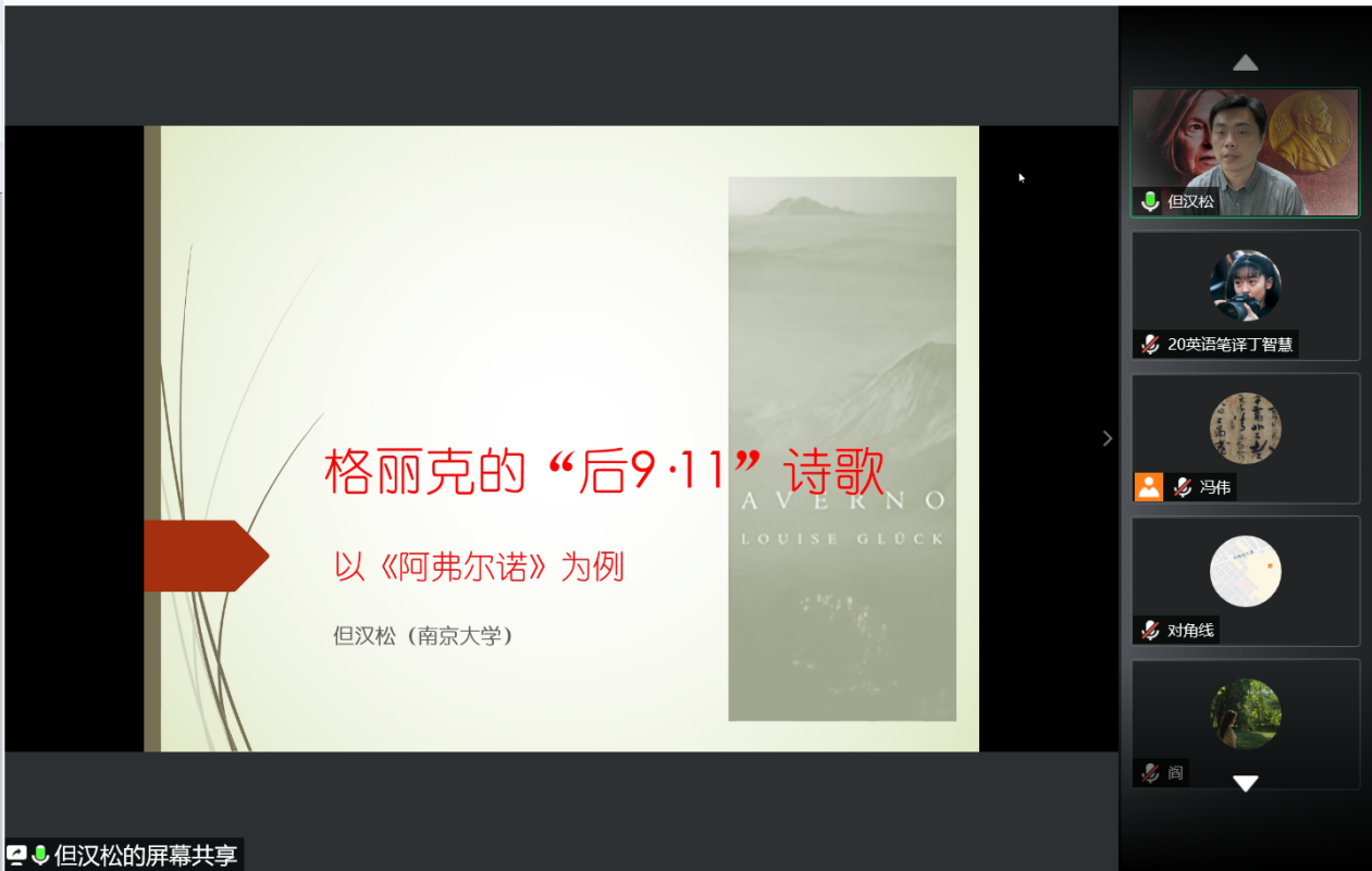 5月21日晚,3003新葡的京集团网址“百廿山大,九秩外院”系列学术报告顺利举办。南京大学但汉松教授做客3003新葡的京集团网址“文渊论坛”,通过腾讯会议线上平台作了题为“格丽克的‘后9·11’诗歌:以《阿弗尔诺》为例”的学术报告。本次报告由3003新葡的京集团网址冯伟教授主持,来自校内外的80余名师生共同参与了本次讲座。