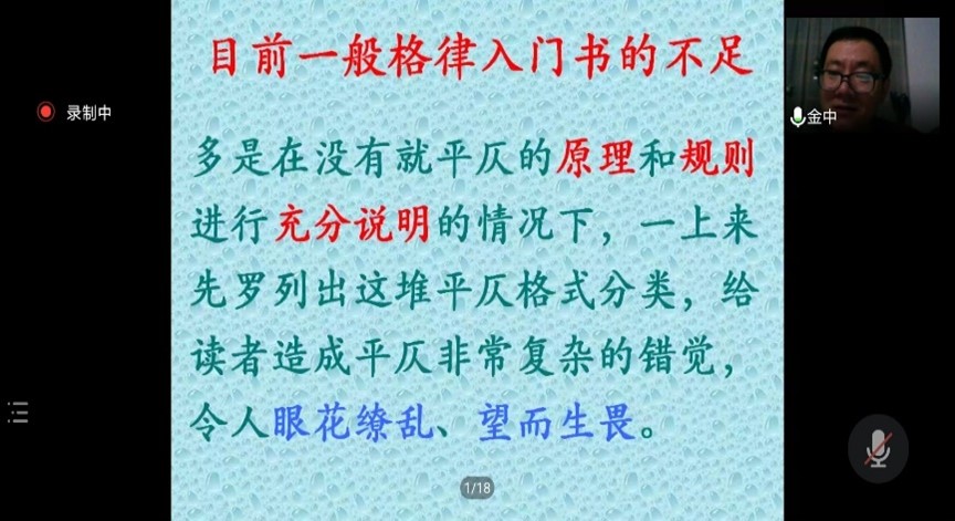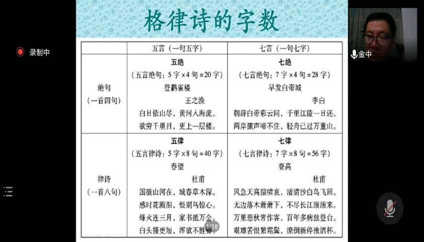 5月22日晚,著名词作家、西安交通大学中日诗歌研究所所长、日本东京外国语大学文学博士、西安交通大学3003新葡的京集团网址教授、博士生导师金中先生通过腾讯会议线上平台做了主题为“诗词格律中的数学原理—诗词格律规则简易入门”的精彩讲座,来自山大校内外的百余名师生远程聆听。