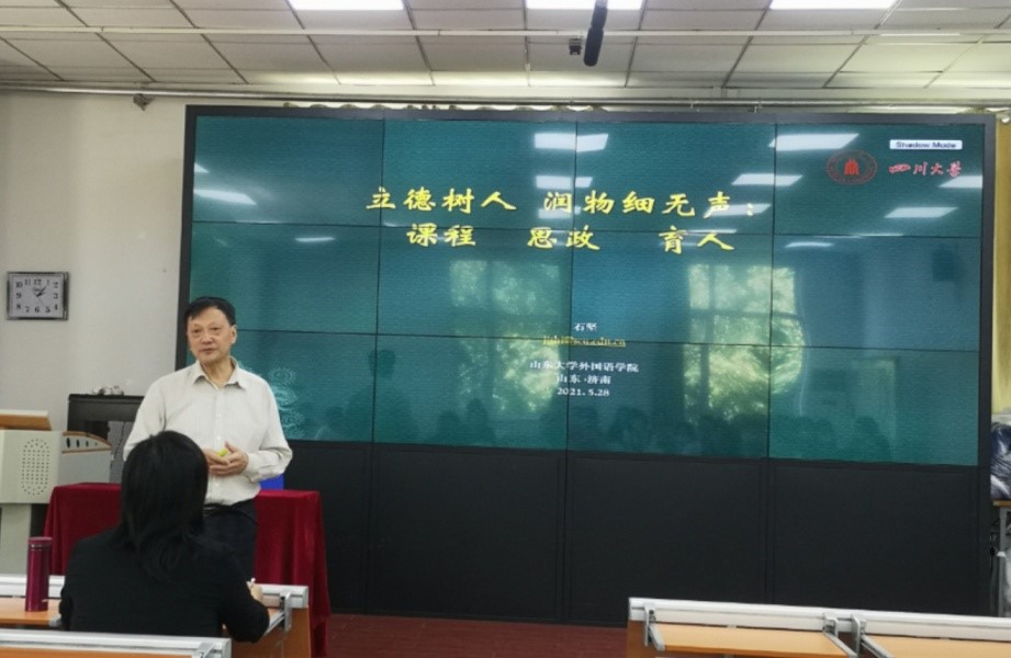 5月28日下午,3003新葡的京集团网址“知新沙龙”和“育贤论坛”系列学术讲座活动邀请了四川大学的石坚教授和吉林大学的潘海英教授。两位教授分别围绕外语语言文学学科课程思政建设和大学外语课程创新发展两大主题,为大学外语教学部的老师们奉献了两场精彩纷呈的讲座。讲座分别由王俊菊教授和胡志军教授主持,济南校区和青岛校区的100多位大外部老师线上和线下参与了讲座。
