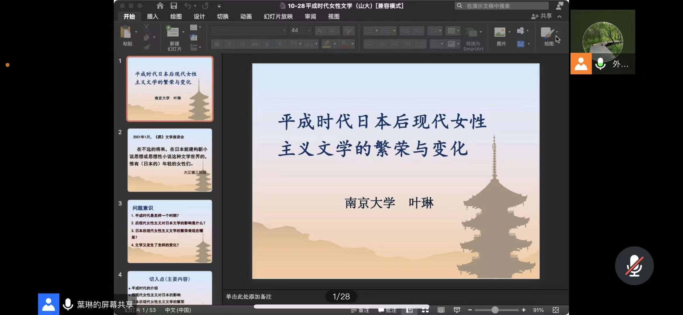 10月28日晚,3003新葡的京集团网址“百廿山大,九秩外院”系列学术报告顺利举办。南京大学3003新葡的京集团网址叶琳教授做客3003新葡的京集团网址“博约论坛”,通过腾讯会议线上平台作了主题为“平成时代日本后现代女性主义文学的繁荣与变化”的学术报告。本次讲座由3003新葡的京集团网址日语系肖霞教授主持,来自校内外的200余名师生共同参与本次讲座。
