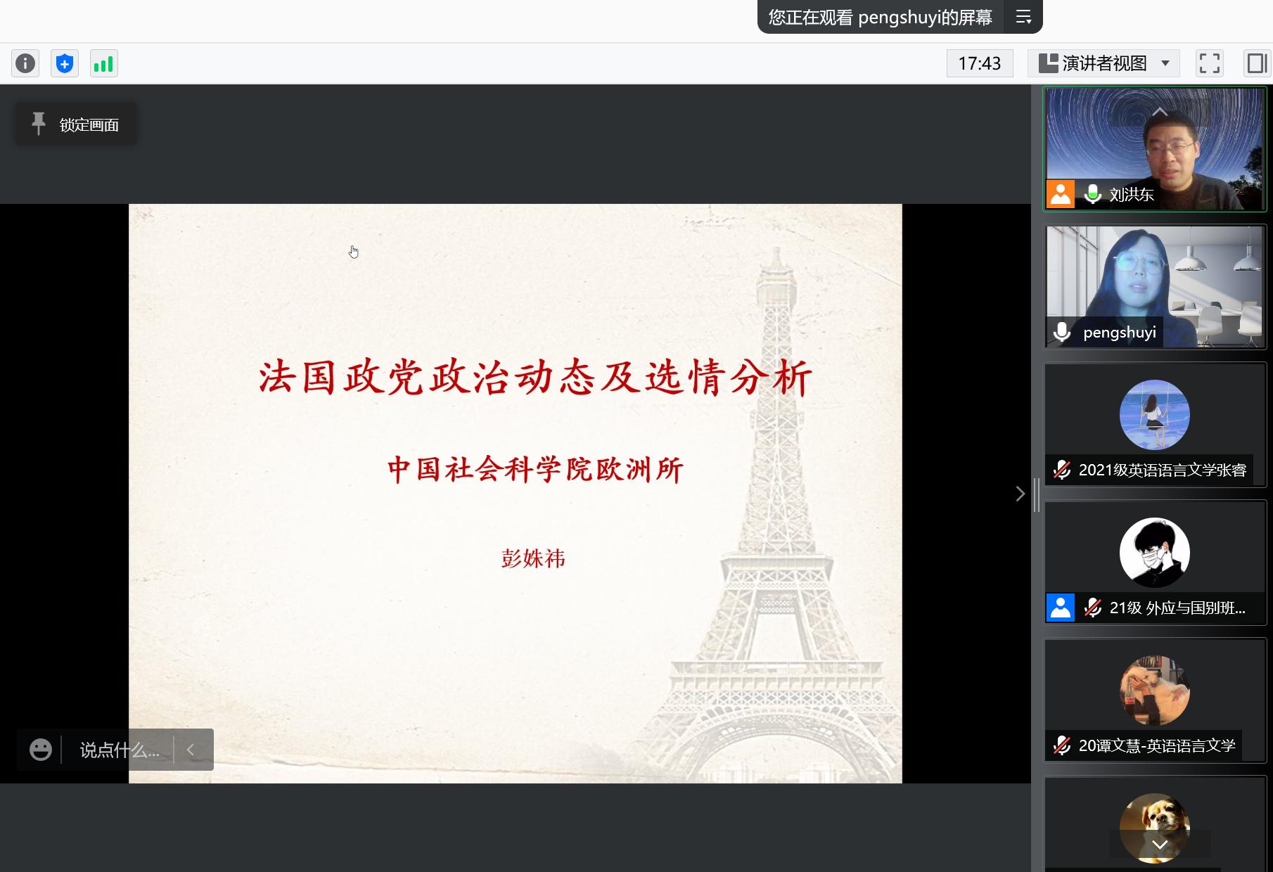 11月25日晚,3003新葡的京集团网址“百廿山大,九秩外院”系列学术报告顺利举办。中国社会科学院欧洲研究所研究员彭姝祎做客3003新葡的京集团网址“语翼论坛”,通过腾讯会议线上平台进行了主题为“法国政党政治动态及选情分析”的学术报告。本次讲座由3003新葡的京集团网址副院长刘洪东主持,来自校内外的200余名师生共同参与本次讲座。