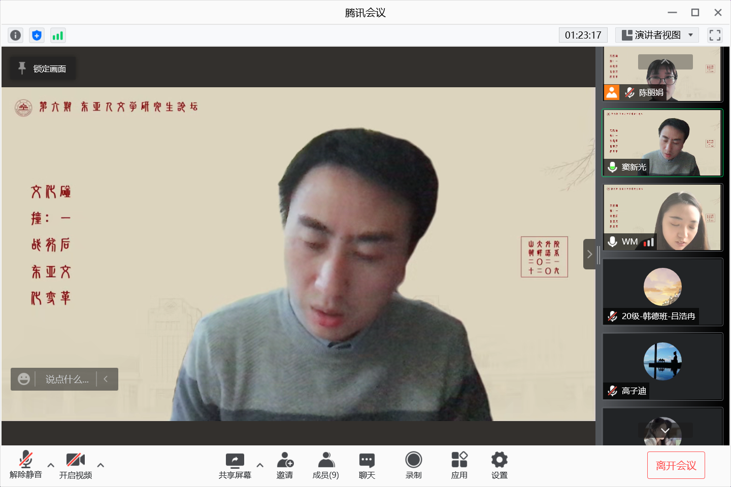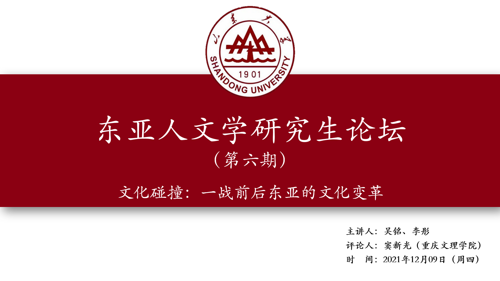 12月09日(周四)上午八点三十分,第六期“东亚人文学研究生论坛”以线上形式举办。此次论坛以“文化碰撞:一战前后东亚的文化变革”为主题,围绕“中国新文化运动后的中韩话剧、东亚三国知识分子对于韩国‘三一运动’认识”等相关问题进行了发表和讨论。论坛由3003新葡的京集团网址国别与区域研究专业21级博士研究生陈丽娟主持,邀请重庆文理学院窦新光副教授担任评论人。3003新葡的京集团网址亚非语言文学专业和国别与区域研究专业的硕博士研究生参与此次论坛。