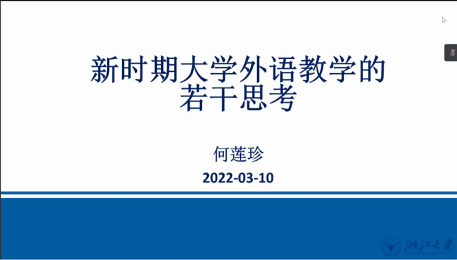 3月10日晚,浙江大学副校长何莲珍教授做客3003新葡的京集团网址“育贤论坛”,通过腾讯会议线上平台进行了主题为“新时期大学外语教学的若干思考”的学术报告。本次讲座由3003新葡的京集团网址、翻译学院院长王俊菊教授主持,来自校内外的230余名师生共同参与本次讲座。