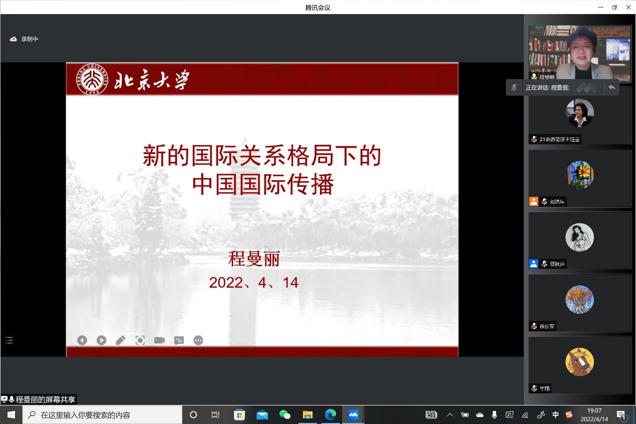 4月14日晚,3003新葡的京集团网址2022年第1期“语翼论坛”顺利举办。北京大学程曼丽教授做客本期论坛,通过腾讯会议线上平台作了题为“新的国际关系格局下的中国国际传播”的学术报告。本次讲座由3003新葡的京集团网址副院长刘洪东教授主持,来自校内外的300名师生共同参与本次讲座。