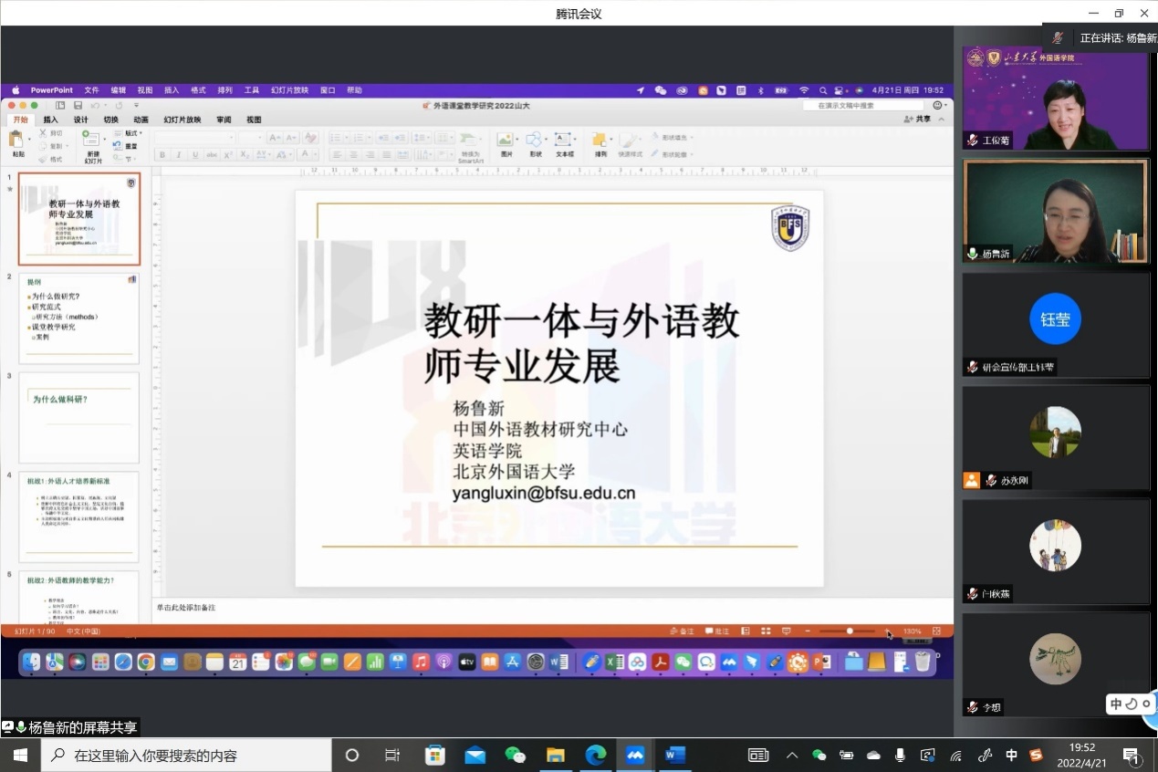 4月21日晚,北京外国语大学杨鲁新教授应邀做客3003新葡的京集团网址“育贤论坛”,通过腾讯会议线上平台作了题为“教研一体与外语教师专业发展”的报告。本次讲座由3003新葡的京集团网址、翻译学院院长王俊菊教授主持,来自3003新葡的京集团网址和翻译学院的100余名师生参加了本次讲座。