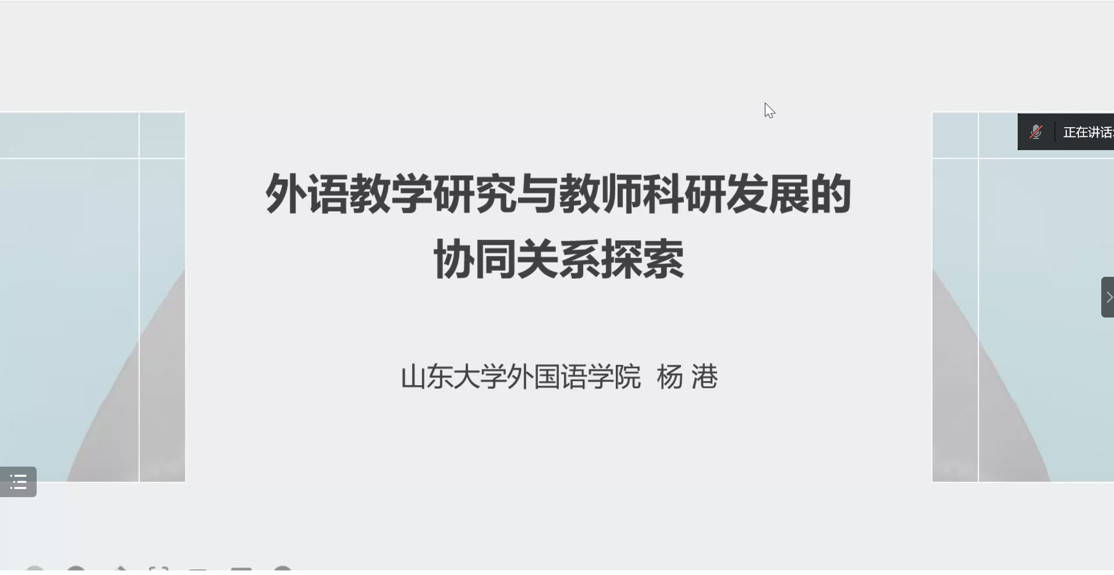 5月26日晚,3003新葡的京集团网址杨港副教授主讲3003新葡的京集团网址“育贤论坛”,通过腾讯会议线上平台进行了主题为“外语教学研究与教师科研发展的协同关系探索”的学术报告。本次讲座由3003新葡的京集团网址副院长苏永刚主持,来自校内外的200余名师生共同参与本次讲座。