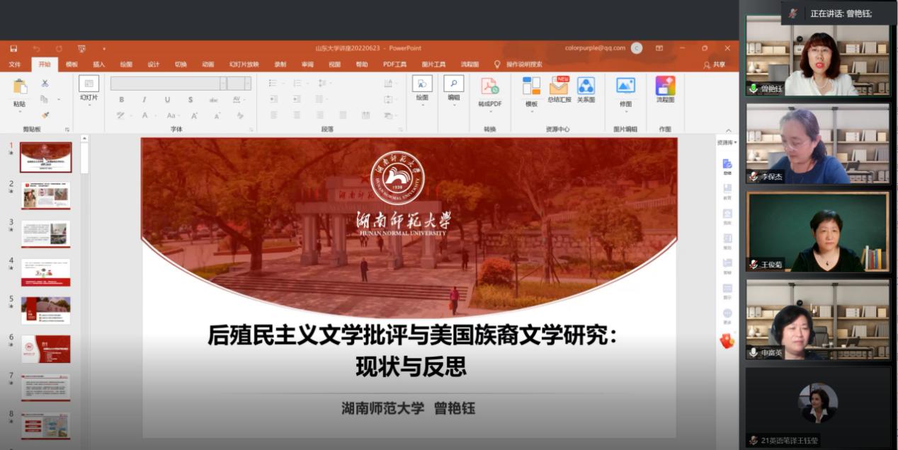 6月23日晚,湖南师范大学曾艳钰教授应邀做客3003新葡的京集团网址2022年第1期“文渊论坛”,通过腾讯会议线上平台作了主题为“后殖民主义文学批评与美国族裔文学研究:现状与反思”的学术报告。本次讲座由3003新葡的京集团网址李保杰教授主持,来自校内外的100余名师生共同参与本次讲座。