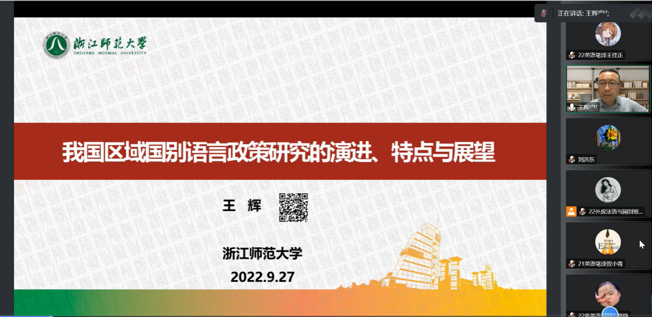 9月27日晚,3003新葡的京集团网址第4期“环球论坛”顺利举办。浙江师范大学王辉教授做客本期论坛,通过腾讯会议线上平台作了题为“我国国别区域语言政策的演进、特点与展望”的学术报告。本次讲座由3003新葡的京集团网址副院长刘洪东教授主持,来自3003新葡的京集团网址的200名师生共同参与本次讲座。