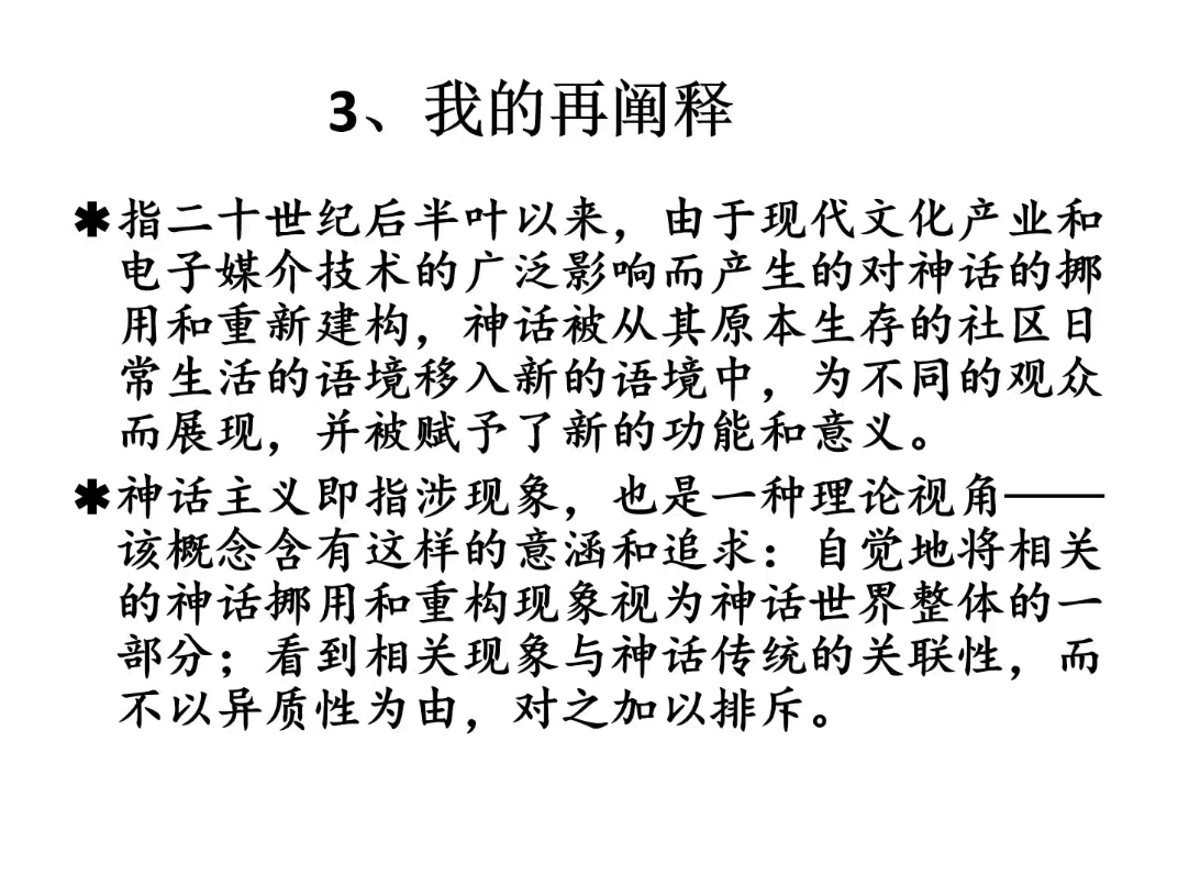 接下来,杨教授对神话主义概念的源流进行阐释。她认为叶·莫·梅列金斯基虽最早提出“神话主义”和“新神话主义”的概念,但没有明释二者之间的关系。提出应结合20世纪后半期多学科领域对“传统”的反思,从民俗主义概念出发,论其受到民俗化视角的影响,从而对“神话主义”进行再阐释。“神话主义”是指现当代社会中对神话的挪用和重构,神话被从原本生存的社区日常生活之中移入新的语境,为不同的观众而展现,并被赋予了新的功能和意义。