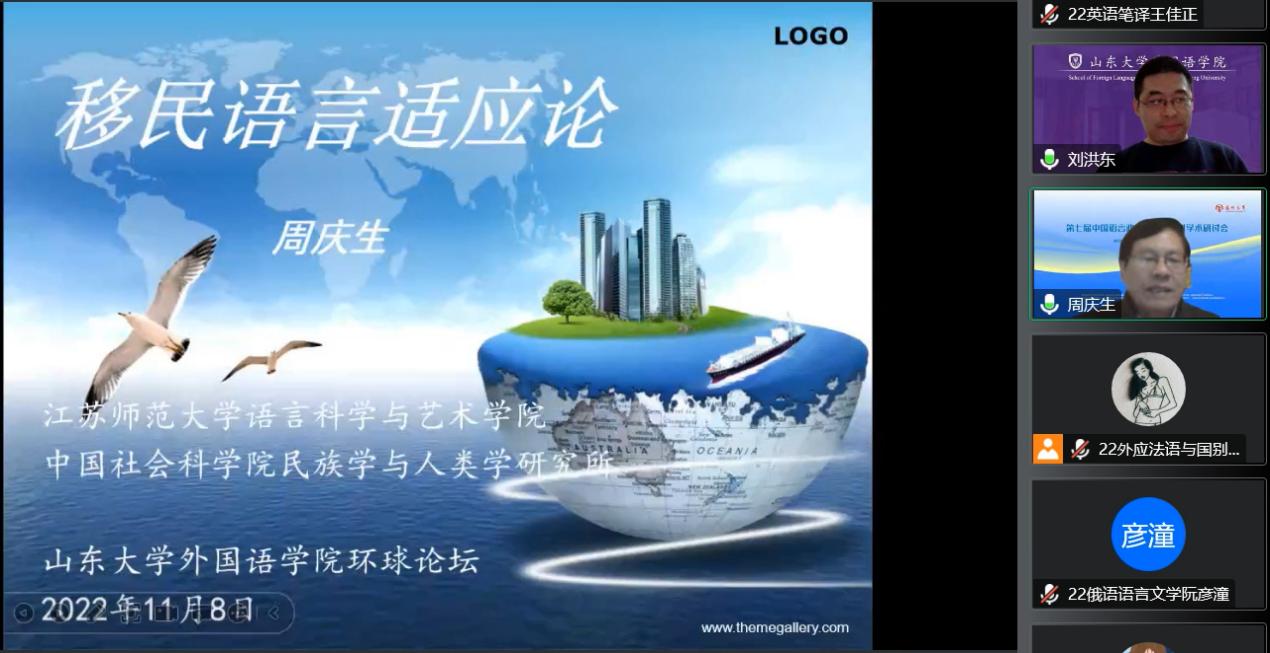 11月8日下午,江苏师范大学周庆生教授应邀做客3003新葡的京集团网址2022年第5期“环球论坛”,通过腾讯会议线上平台作了主题为“移民语言适应论”的学术报告。本次讲座由3003新葡的京集团网址副院长刘洪东教授主持,来自校内的200余名师生共同参与了本次讲座。