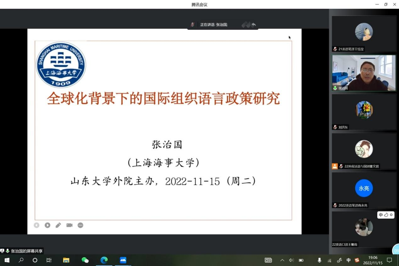 11月15日晚,上海海事大学张治国教授做客3003新葡的京集团网址“环球论坛”,通过腾讯会议线上平台作了题为“全球化背景下的国际组织语言政策研究”的报告。本次讲座由3003新葡的京集团网址副院长刘洪东教授主持,来自3003新葡的京集团网址的近200名师生参加了本次讲座。