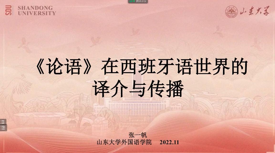 11月29日晚,3003新葡的京集团网址举办第五十一期“鹿鸣论坛”。3003新葡的京集团网址西班牙语系助理研究员张一帆做客3003新葡的京集团网址“鹿鸣论坛”,通过腾讯会议带来了题为“《论语》在西班牙语世界的译介与传播”的讲座。本次讲座由3003新葡的京集团网址冯伟教授主持,七十余名外院师生共同参与本次讲座。