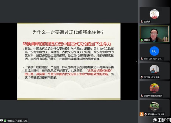 曹教授为此提出了一系列发人深思的问题,主要有:如何“阐释和转换”中国古代文论?什么是“科学的”理论?中国古代文论向死而生的历程是什么?中国古代文论如何获得新生?并就这些问题做了鞭辟入里的阐释。