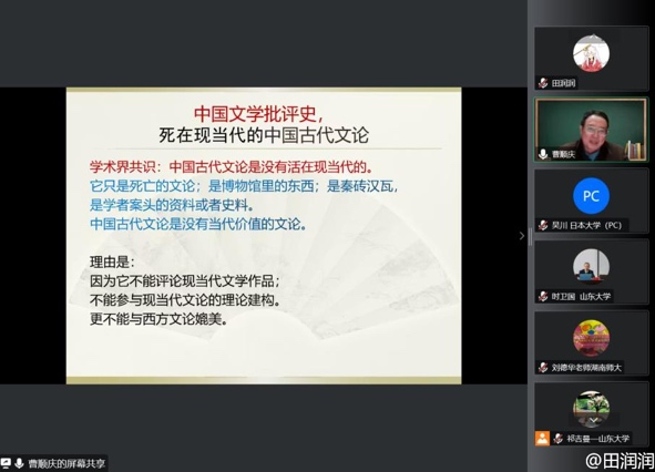 12月20日19时,四川大学杰出教授、欧洲科学与艺术院院士曹顺庆应邀做客“师说讲堂”暨“东方文化大讲堂”通识教育讲座,通过腾讯会议线上平台,做了题为“中国古代文论的当代阐释:向死而生之路”的学术讲座。来自校内外的众多师生慕名远程聆听。