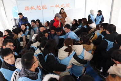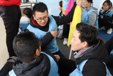 第一个项目是团队热身,每名女生代表一元,每名男生代表五角,根据给出的人民币数额进行抱团。学生们兴致盎然、斗志满满,热火朝天地进行游戏,即便天气寒冷、大雪纷飞,气氛却很快热闹起来。第二个项目是达芬奇密码,每队挑选十人传递信息,由各队挑一名队长监督对方。在朱吉伟给出数字或成语的信息后,队员们按照每轮的规则要求进行传递。信息在传递过程中不免产生偏差,在公布结果的那一刻,现场欢声笑语、热闹非凡,大家在这一项目中深刻地理解了团队沟通的重要意义。第三个项目是信任背摔,在这个项目开始之前,朱吉伟和高艳亮向大家讲解标准姿势和注意事项,然后分别带领两队成员前往背摔设施。背摔台上积了一层白雪,冷风肆虐,大家在寒风中不停地跺脚,对这个项目能否顺利进行产生深深的担忧。刘智泉首先站上背摔台,作为第一位参与者向大家做出示范。然后,大家在教练的鼓励下分成几组,无惧严寒,出色地完成了这一项目,展现了团队成员们强大的心理素质和对彼此的信任,拉近了队员们间的距离。