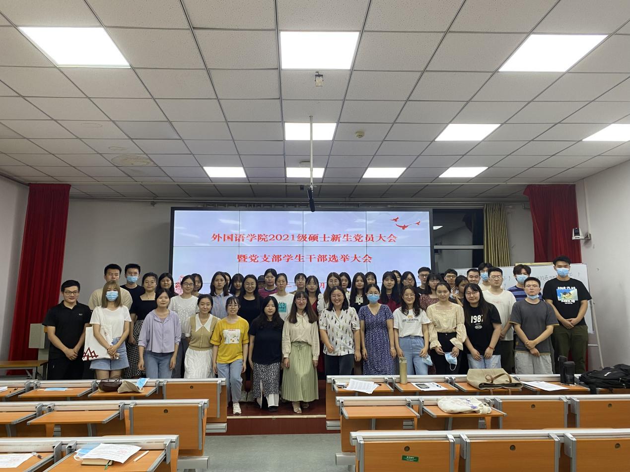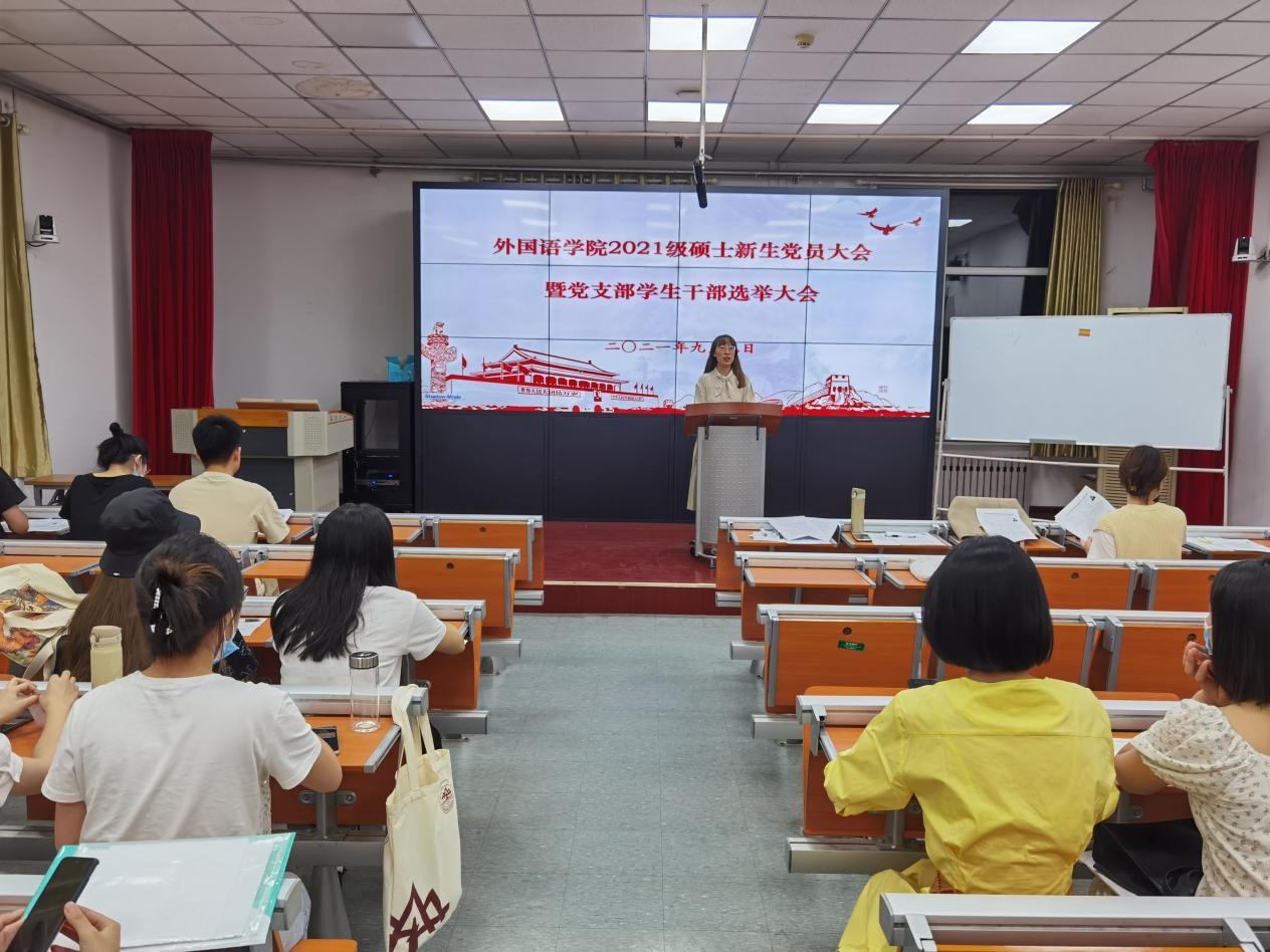 本次大会由2020级年级会副主席、2020级英语与外应学术硕士党支部书记吕鹏飞主持。会议伊始,吕鹏飞简要介绍了参会人员,并对2021级全体硕士新生党员表示欢迎。随后,张新苑老师发表讲话,她强调作为研究生党员要注重党性修养,发挥先锋模范作用,认真学习党的理论和知识,时刻关心国家时事要闻,将党的优良传统落实到具体的工作和学习当中;她也强调,身为一名中国共产党员,应该严格要求自己,切实落实支部组织生活纪律,同时要积极参与主题党日活动以及学院举办的各项学生活动,并在各项活动中发挥先进性、引领性作用。接着,吕鹏飞对研究生三个党支部的组织架构以及各支部委员的工作职责进行了详细介绍。随后,各候选人按照第一、第二、第三党支部的顺序,依次上台进行竞职演讲,并接受辅导员老师和党员骨干的提问,充分展现了新时代青年党员昂扬自信的精神风貌。最后,全体正式党员以无记名投票的方式推选出各支部学生干部候选人,并与辅导员张新苑老师合影留念。