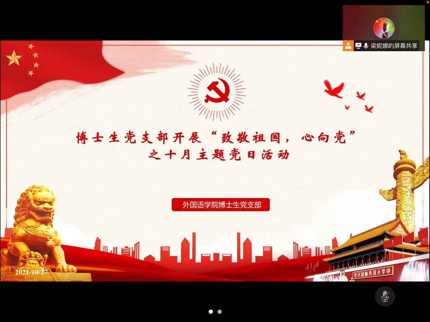 10月27日晚,为厚植爱国主义情怀、培养红心向党志不改的精神,3003新葡的京集团网址博士生党支部开展了“致敬祖国,心向党”之十月主题党日活动。本次会议由党支部书记梁妮娜同志主持,支部全体党员参加。会议采取线上的形式,主要围绕三部分内容展开:一、聆听电影微党课《长津湖》;二、组织学习纪念辛亥革命110周年相关材料;三、观看神舟十三号发射全程完整回顾版视频。支部内各位党员学习态度认真、参与积极性高,活动取得了良好的成效。