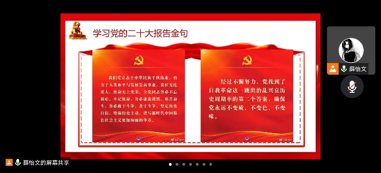 首先,薛怡文组织带领全体学生骨干学习党的二十大报告,并重点学习了党的二十大报告主题与党的二十大报告金句,这一学习过程使同学们对党的二十大报告有了更加深刻的理解。