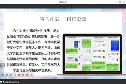 最后,外院学生会素拓部成员向大家介绍了青鸟计划的内容。她说明了青鸟计划的参与情况及参与步骤,并希望同学们能通过参与青鸟计划实现实习与就业目标。